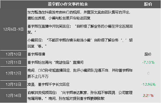 12月,东方甄选“小作文”事件引起舆论热议。起因是东方甄选在“吉林之行”视频下,置顶了“宣传文案出自谁手”的解答评论,称经典小作文多数由文案团队创作,并非全部出自主播之手。此言一出,不少网友质疑:“为什么要否认董宇辉为东方甄选做出的贡献?”。12月13日,东方甄选股价应声大跌近13%。