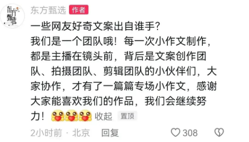 诚然,“小作文并非完全出自董宇辉之手”是事实,很多网友心里也很清楚这样的事实,毕竟单凭董宇辉一己之力,很难在短时间内完成那么多高质量的稿子,那么其背后必然会有一个支持团队。