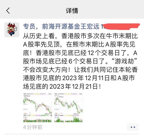 近日,前海开源基金终身顾问王宏远发表观点称,“从历史上看,香港股市多次在牛市末期比A股率先见顶,在熊市末期比A股率先见底!香港股市见底已经12个交易日了,A股市场见底已经6个交易日了。“游戏劫”不会改变大方向!让我们共同记住本轮香港股市见底的2023年12月11日和A股市场见底的2023年12月21日!”