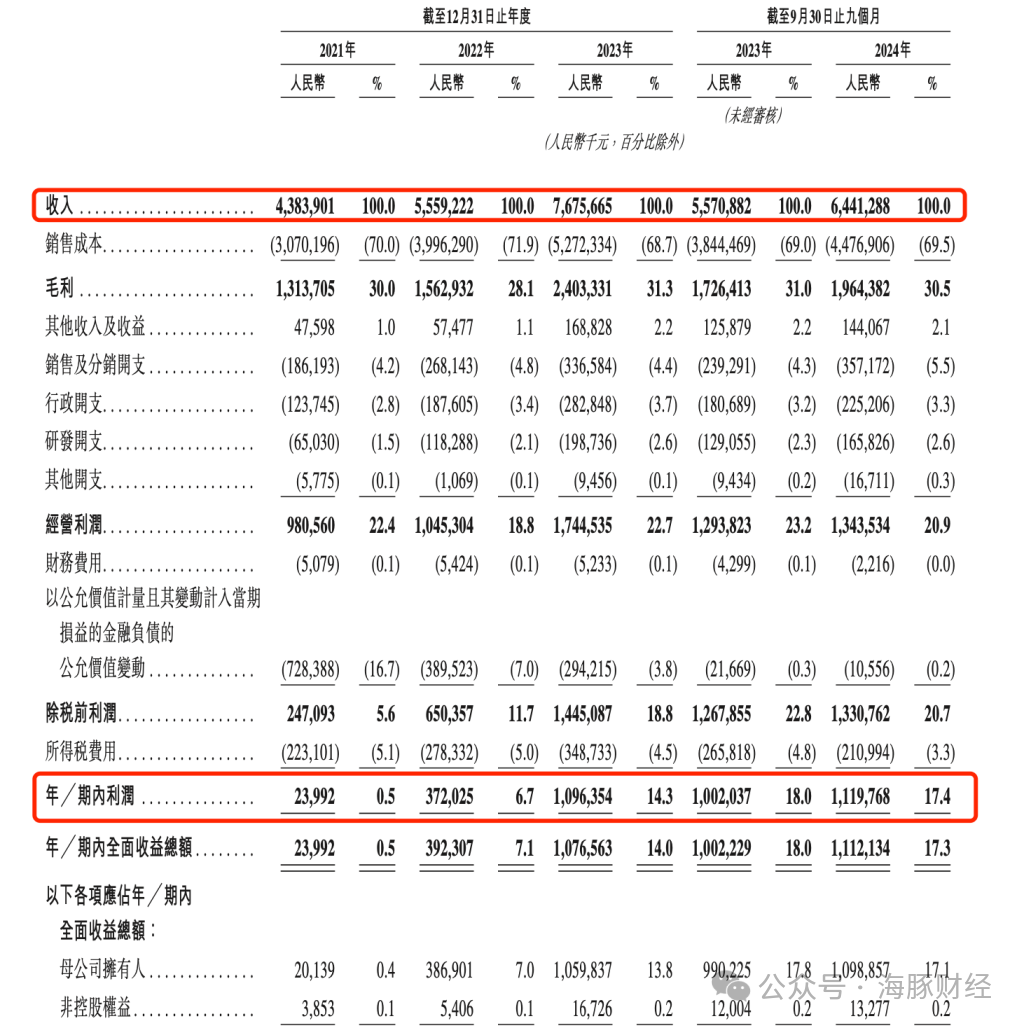 利润方面,2021年、2022年及2023年年度利润分别为0.24亿元、3.72亿元及10.96亿元;经调整利润(非国际财务报告准则计量)分别为7.7亿元、7.88亿元及14.59亿元。据计算,2022和2023年年度利润分别同比增超14倍和增近2倍。经调整利润分别同比增长2.34%和85.15%。